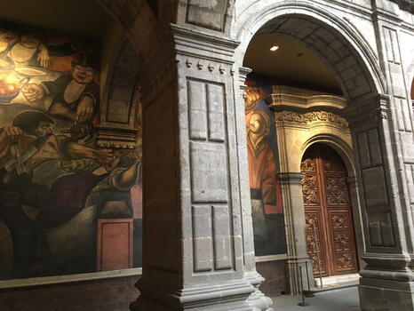 Les bâtiments du XVIe siècle abritent des œuvres murales commandées par le gouvernement mexicain dans les années 1920 célébrant l’histoire et le Mexique post révolutionnaire. Les peintres ayant contribué à la réalisation des fresques sont notamment José Clemente Orozco, David Alfaro Siqueiros, Jean Charlot et bien entendu, celui qui a été le fil rouge de cette semaine : Diego Rivera.